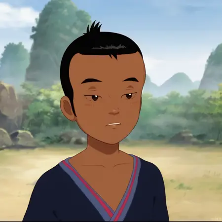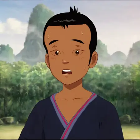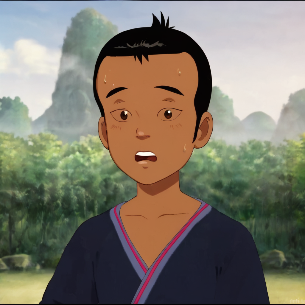 indigo blue kimono, zhi, short hair, black hair, monolid eyes, black eyes, dark skin