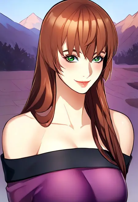 5. ((美丽的露肩性感紫色连衣裙,黑色镶边,巨大乳沟,下流乳沟,)),黑色高跟鞋,