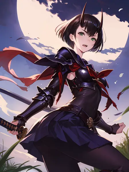 Extra elements:sword,holding weapon,katana,moon,horns,fangs