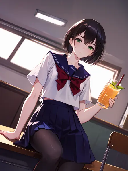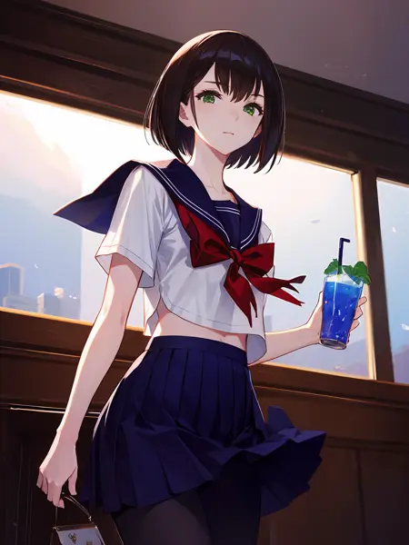 Basic: Black hair,short hair(pony tail),green eyes,serafuku,bowtie,pleated collar,pleated skirt,armor,gauntlets,pantyhose,(armored boots)