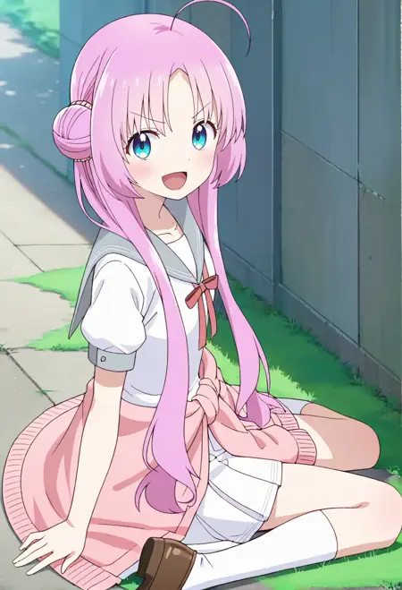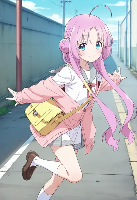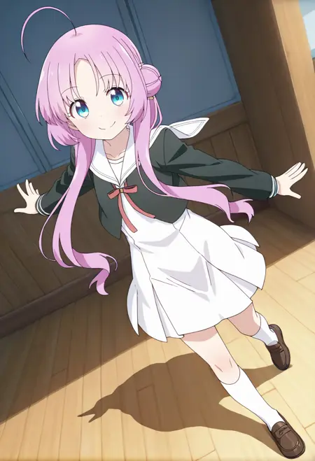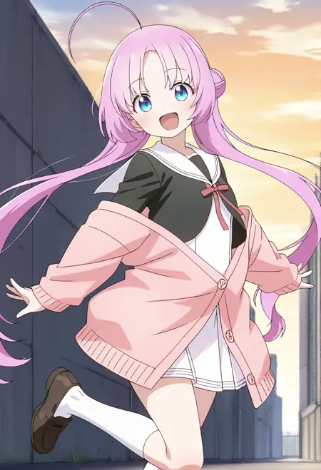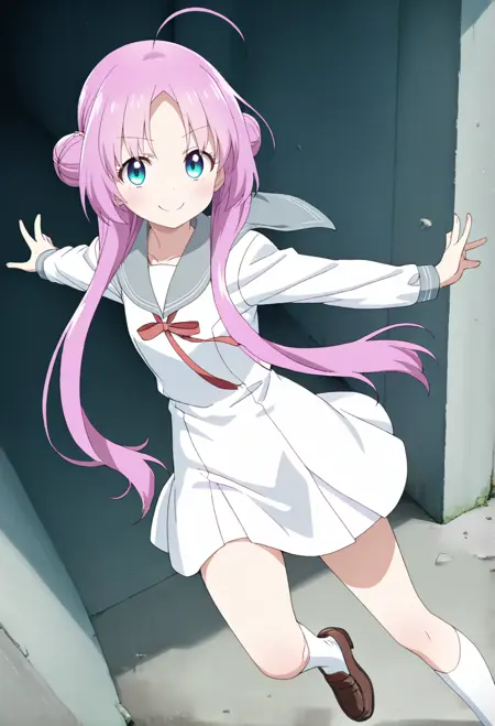 yuu-default,blue eyes,pink hair,double bun,long hair,ahoge,school uniform,pink cardigan,grey sailor collar,white dress,long sleeves,pleated dress,white socks,loafers