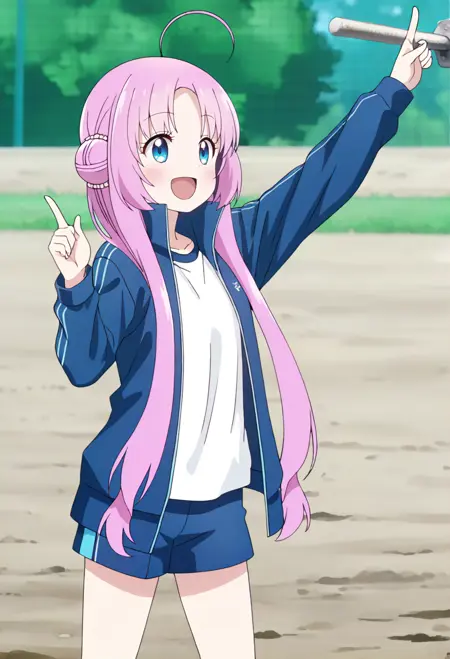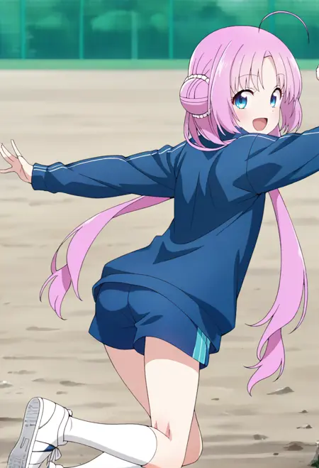 yuu-gym,blue eyes,pink hair, double bun,long hair,ahoge,twintails,blue track jacket,blue track shorts,gym shirt,white t-shirt,white socks,sneakers