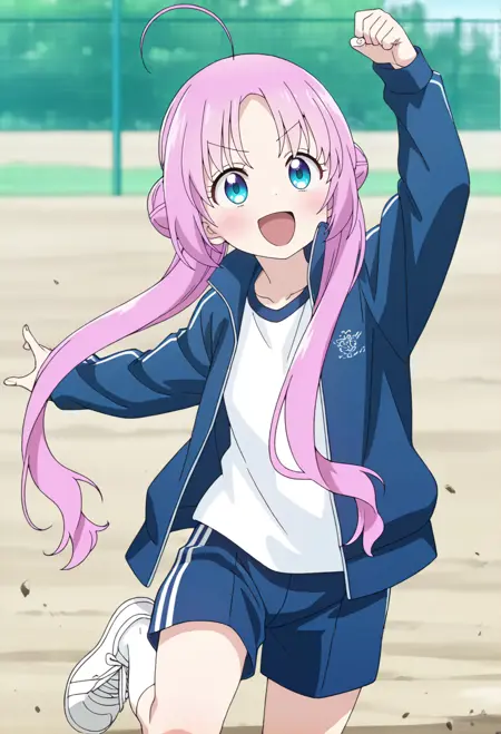 yuu-gym, 파란 눈, 분홍색 머리, 더블 버니, 긴 머리, 아호게, 트윈테일, 파란 트랙 재킷, 파란 트랙 바지, 체육복 상의, 흰색 티셔츠, 흰색 양말, 스니커즈
