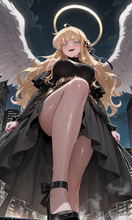 Uriel, green eyes, blonde eyelashes, blonde hair, long hair, hair ribbon, braided bun, bangs, ahoge, halo, angel wings, black ribbon, black dress, black high heels