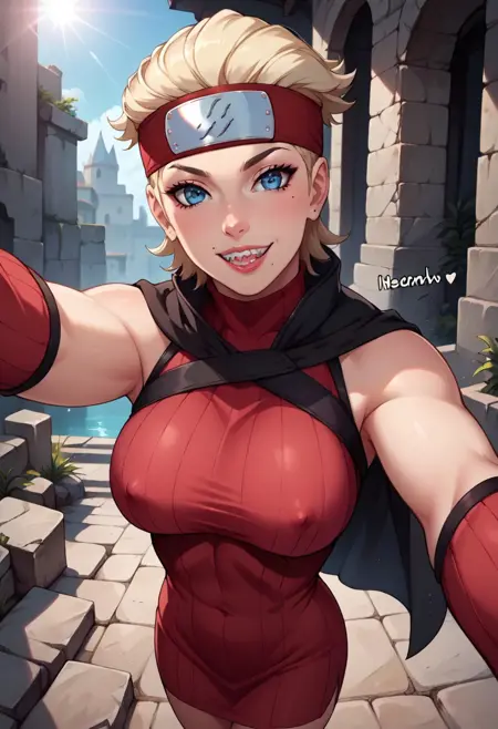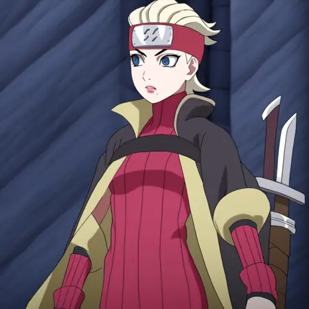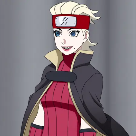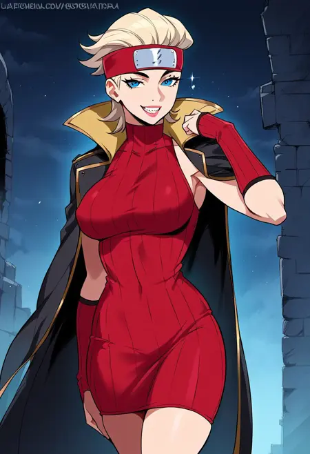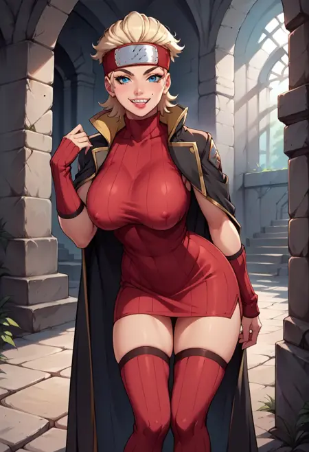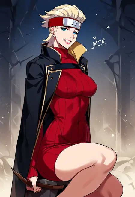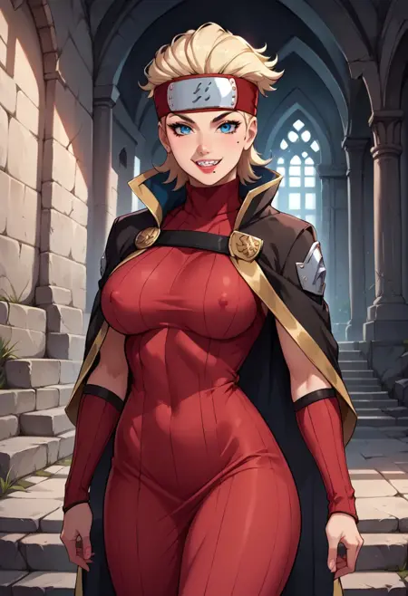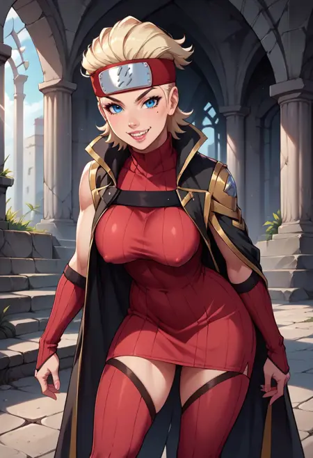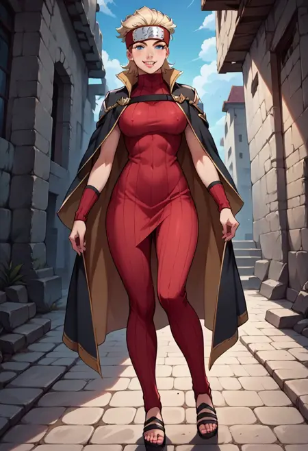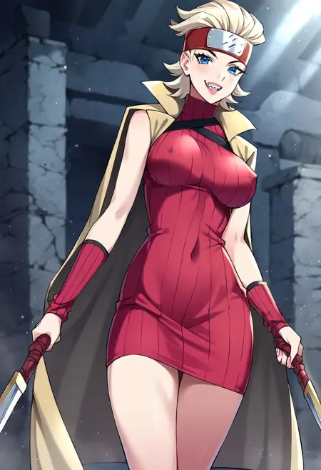 BuntanKurosukiBNNG, 1girl, solo, 평균 키 여자, 창백한 피부, 마른 체형, 단발, 금발, 곧게 뒤로 빗은 머리, 미모 점, 입술, 날카로운 이빨, 파란 눈, 큰 가슴, 빨간 터틀넥, 줄무늬 터틀넥, 소매 없는 터틀넥, 짧은 치마, 레그gings, 이마 보호대, 긴 손목 감싸개, 긴 소매 검은 코트, 망토 코트, 점, 무기, 쌍검, 샌들,