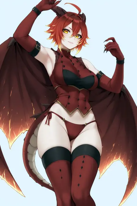 Rodan プロンプト: 1girl, wings, short hair, red hair, gradient hair, small dragon tail, clawed feets, thick thighs, large breast