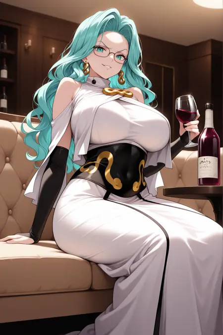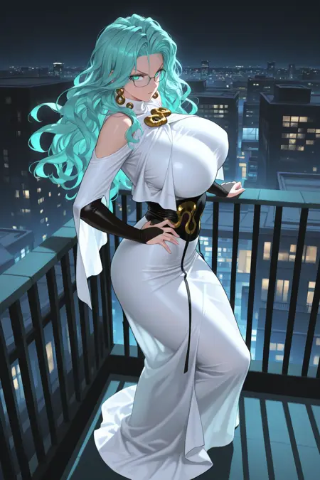 彼女の典型的な外見には、「イヤリング、眼鏡、タートルネック、白いドレス、肩の切り替え、裸の肩、黒いアンダーバスト、ゴールドのブローチ、黒い肘までの手袋、ブライダルガントレット、長いドレス」を追加してください。
