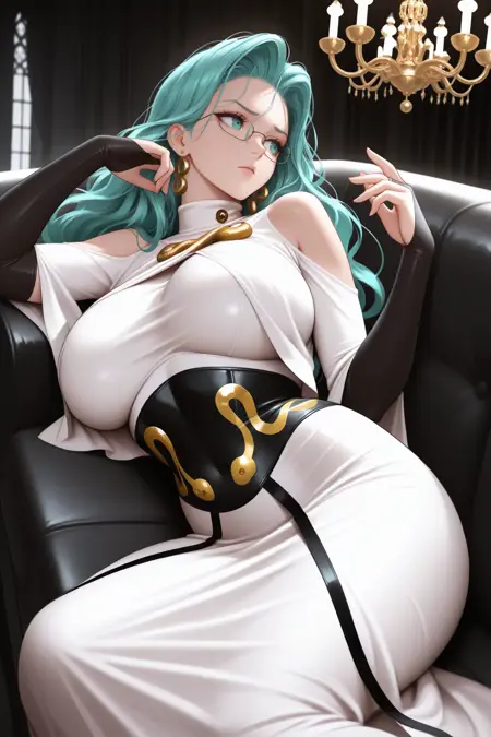 Add "earrings, glasses, turtleneck, white dress, shoulder cutout, bare shoulders, black underbust, gold brooch, black elbow gloves, bridal gauntlets, long dress" for her typical look.