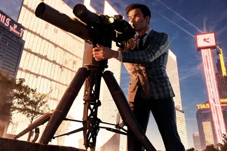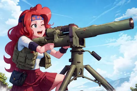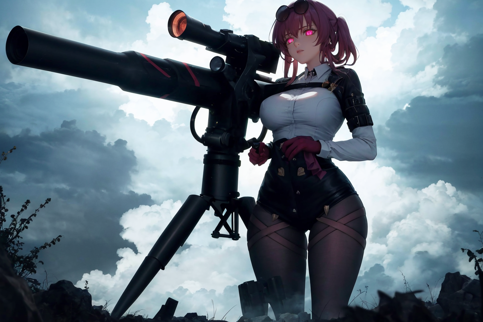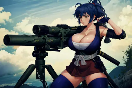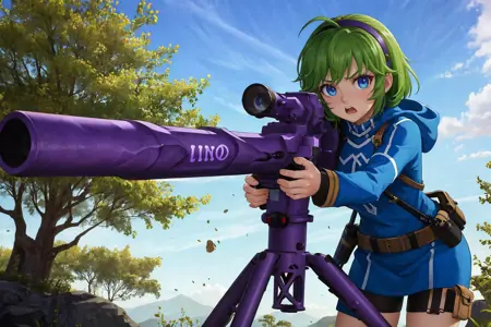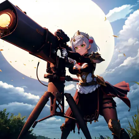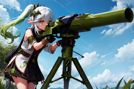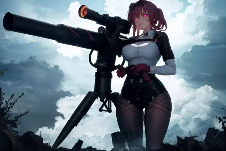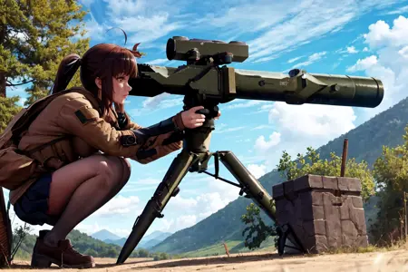 可使用辅助提示,如 1girl, solo, aiming, leaning forward 等。