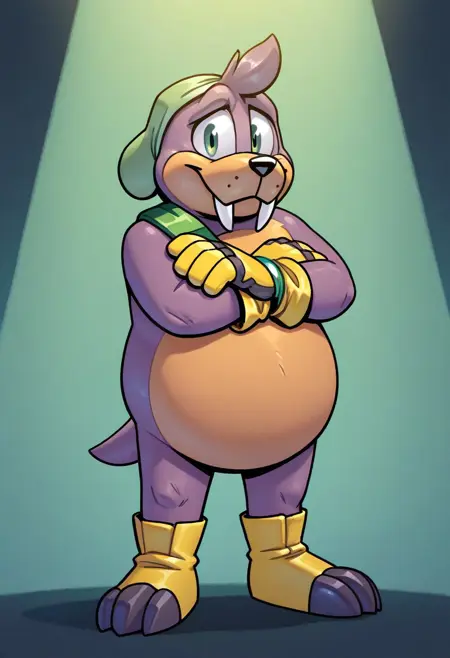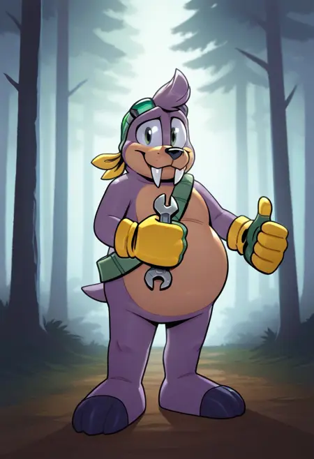 Rotor the Walrus, tusks, light purple skin, pale green eyes, backwards yellow cap, green utility belt across shoulder, yellow gloves