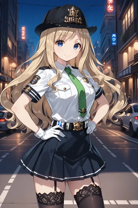 police: police uniform, bowler hat, hat ribbon, collared shirt, white shirt, short sleeves, green necktie, white gloves, belt, pleated skirt, black skirt, garter straps, black thighhighs