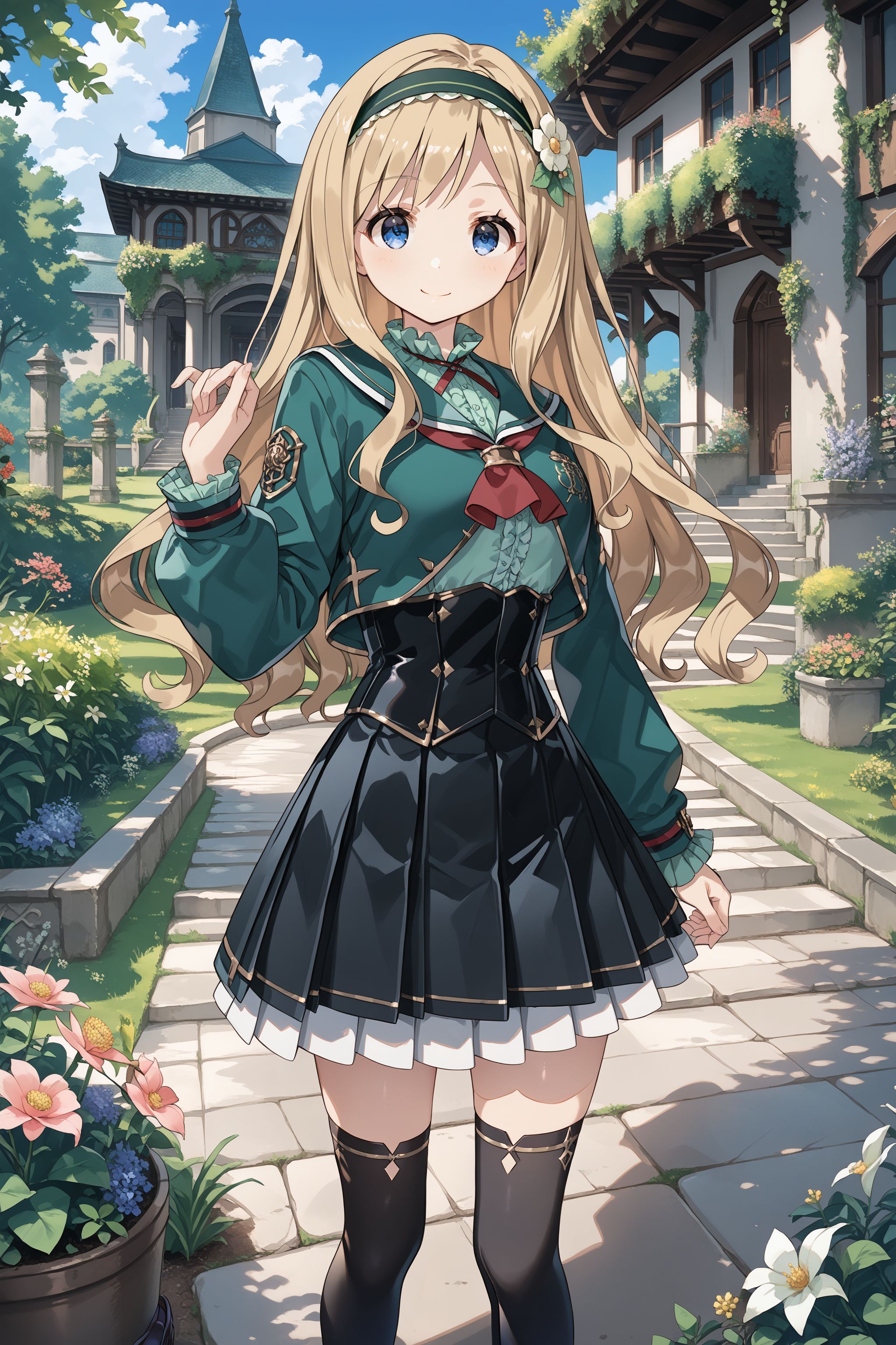 school: green hairband, hair flower, school uniform, cross tie, green jacket, long sleeves, crop top, red neckerchief, green shirt, frilled shirt, corset, black skirt, pleated skirt, black thighhighs, loafers
