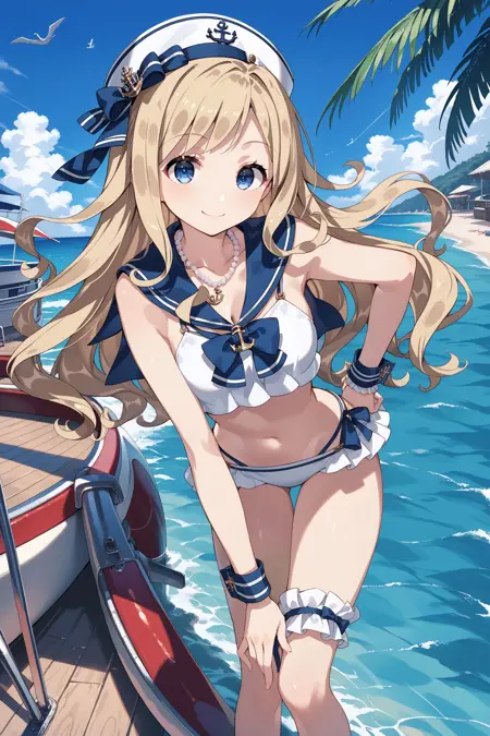 bikini1: sailor hat, hat bow, white headwear, bead necklace, sailor bikini, white bikini, blue sailor collar, blue bowtie, cleavage, navel, bare arms, wrist cuffs, anchor symbol, bridal garter, blue ribbon