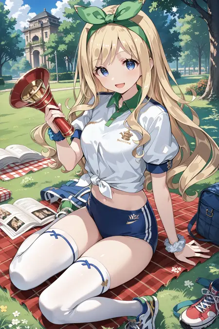 gym: bow hairband, green bow, gym uniform, green collar, white shirt, puffy short sleeves, tied shirt, navel, wristband, wrist scrunchie, buruma, white thighhighs, sneakers