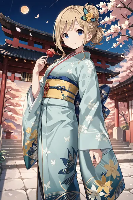 kimono: butterfly hair ornament, braid, hair bun, sidelocks, hair flower, pink flower, long sleeves, japanese clothes, light green kimono, floral print, yellow flower, wide sleeves, sleeves past wrists, obi, sash, brown flower