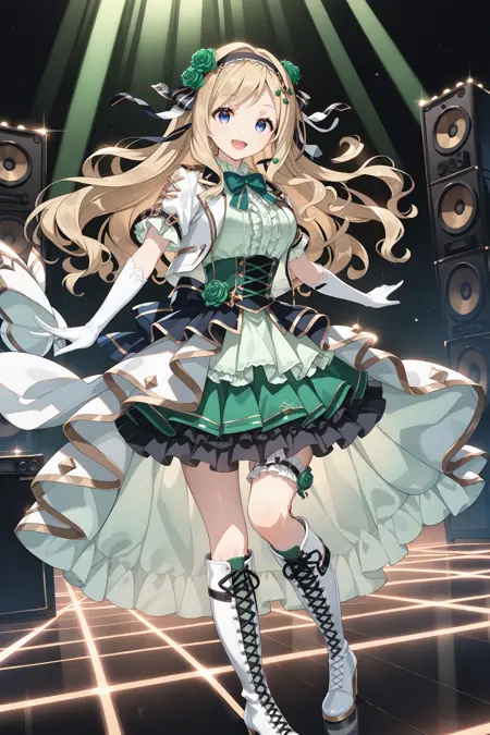 idol: idol costume, hairband, hair bow, hair flower, green rose, white jacket, short sleeves, open jacket, light green dress, green bowtie, center frills, elbow gloves, white gloves, layered skirt, frilled skirt, green skirt, bridal garter, knee boots, cross-laced footwear, heels, white boots,