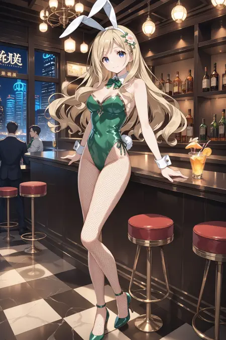 bunny: playboy bunny, hair flower, detached collar, green bowtie, green leotard, gold trim, wrist cuffs, rabbit tail, fishnet pantyhose, heels