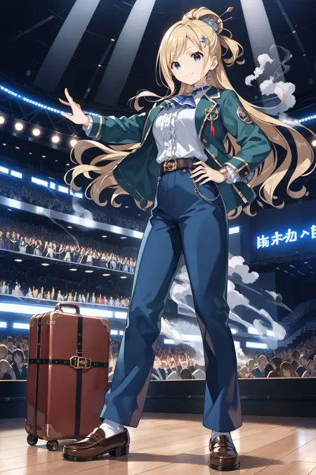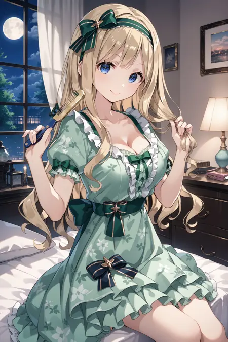 blue eyes, blonde hair, long hair, very long hair, wavy hair, medium breasts, large breasts,