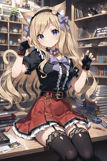 cat: cat ears, animal ear fluff, black hairband. hair bow, purple bow, black bowtie, neck bell, black shirt, lace trim, frills, short sleeves, elbow gloves, fingerless gloves, asymmetrical gloves, belt, red skirt, pleated skirt, cat tail, garter straps, black thighhighs