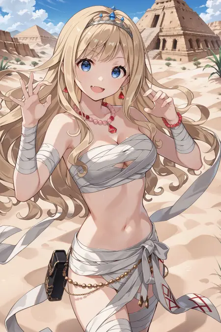 mummy: mummy costume, tiara, earrings, pink jewelry, naked bandage, bead necklace, jewelry, navel, cleavage, bandaged arm, bead bracelet