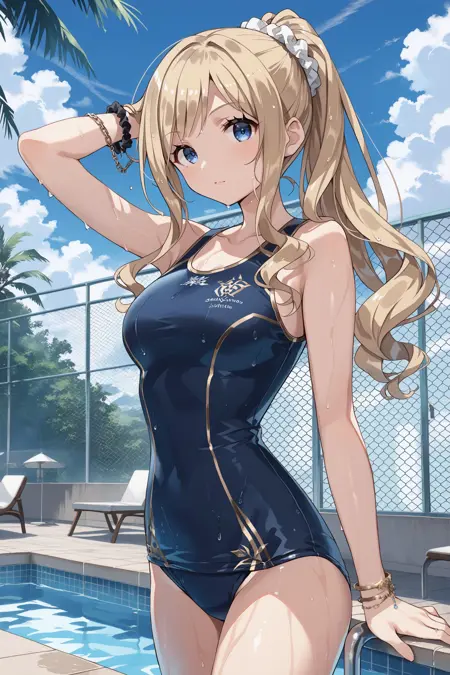 school swimsuit: ponytail, hair scrunchie, school swimsuit, gold trim, bracelet
