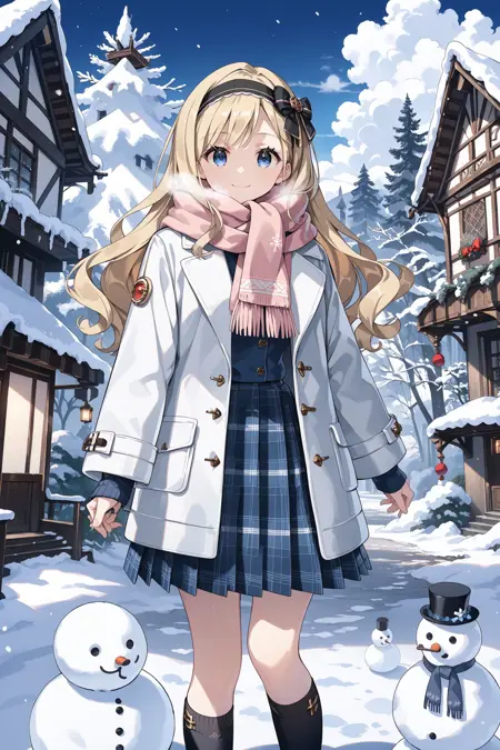 winter1: bow hairband, black bow, pink scarf, winter coat, white coat, long sleeves, pleated skirt, plaid skirt, blue skirt, black socks, loafers