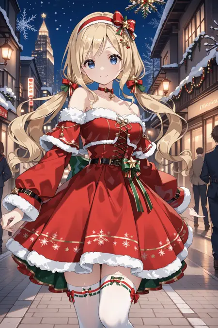 santa: santa costume, red hairband. hair ornament, low twintails, hair bow, red bow, choker, star \(symbol\), jewelry, red dress, fur trim, frills, strapless, bare shoulders, detached sleeves, long sleeves, white thighhighs