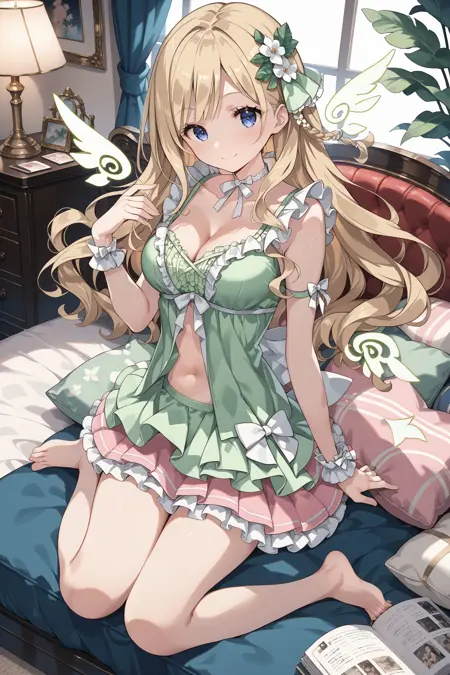 babydoll: hair ornament, hair flower, choker, white bow, green babydoll, frills, cleavage, navel, mini wings, wrist ribbon, frilled skirt, pink skirt, barefoot