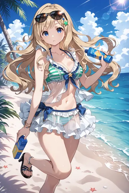 bikini2: sunglasses on head, star hair ornament, babydoll, see-through, frilled bikini, striped bikini, green bikini, collarbone, frills, bikini skirt, sandals, heels