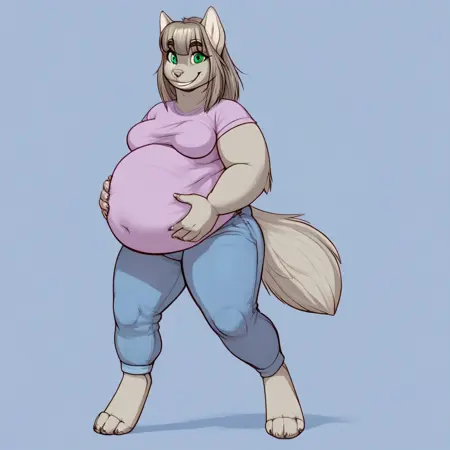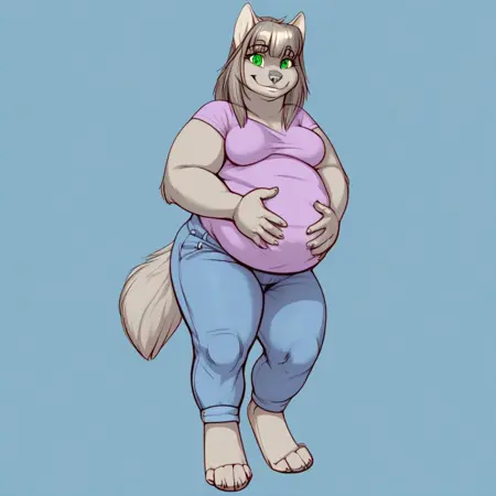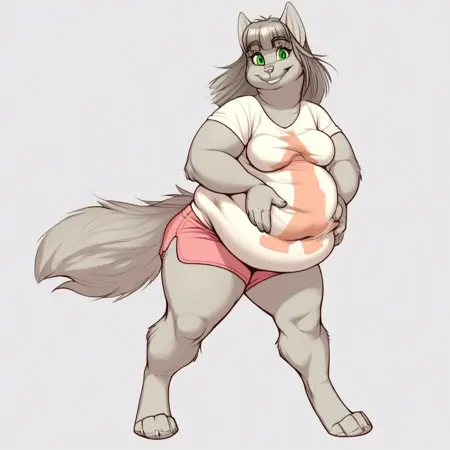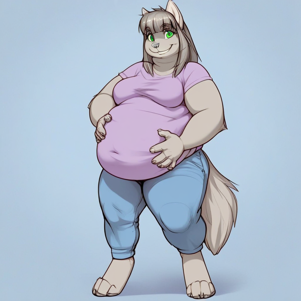 Wolf, wolfgirl, grey fur, grey hair, bangs, fluffy tail, green eyes, fat, chubby, big belly,
