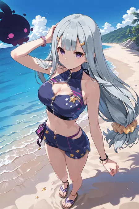 パープル水着: ヘアクリップ、ヘアスクランチ、ヘアリボン、星柄、パープル水着、ノースリーブ、ハーネック、ジッパー、星(symbol)、バストカットアウト、ショートトップ、へそ、ブレスレット、ビキニパンツ、アンクレット、サンダル
