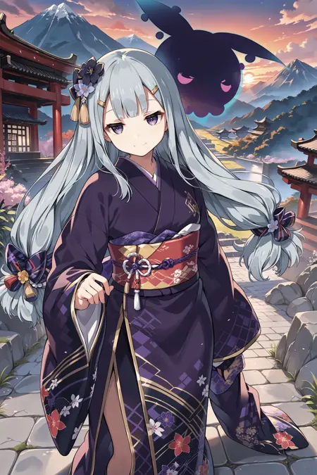 着物: 髪飾り、ヘアフラワー、ヘアリボン、花ヘアクリップ、紫着物、花柄、長袖、広袖、指先より長い袖、不規則な袖、固定パターン、アーグル袖、帯