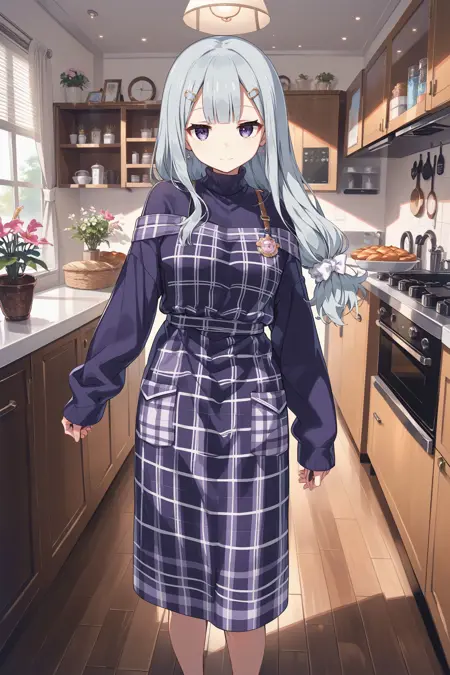 エプロン: ヘアクリップ、白リボン、ヘアスクランチ、タートルネック、紫セーター、長袖、指先より長い袖、紫エプロン、エプロンドレス、チェックエプロン、固定パターン、ポケット、花のバッジ、ストラップスリップ、デニムパンツ