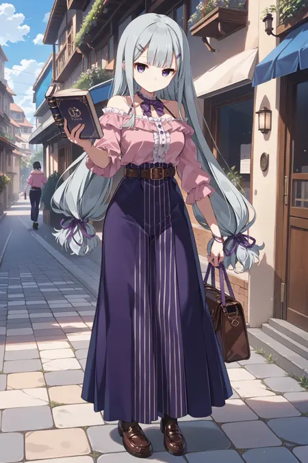 ホリデー1: ヘアクリップ、ヘアリボン、紫のリボン、ハーネックレオタード、ピンクシャツ、肩出しシャツ、フリル、ストラップ、紫のネクタイ、ベルト、紫のスカート、ロングスカート、縦縞
