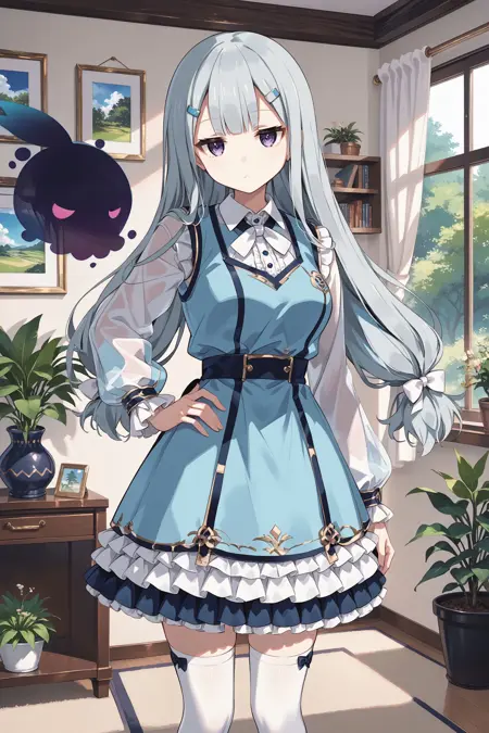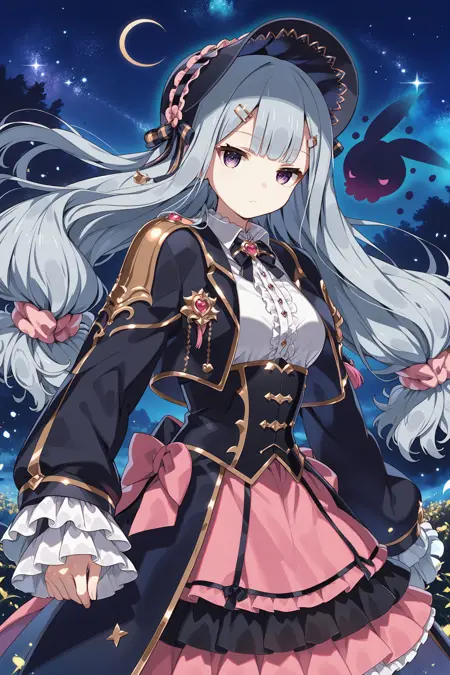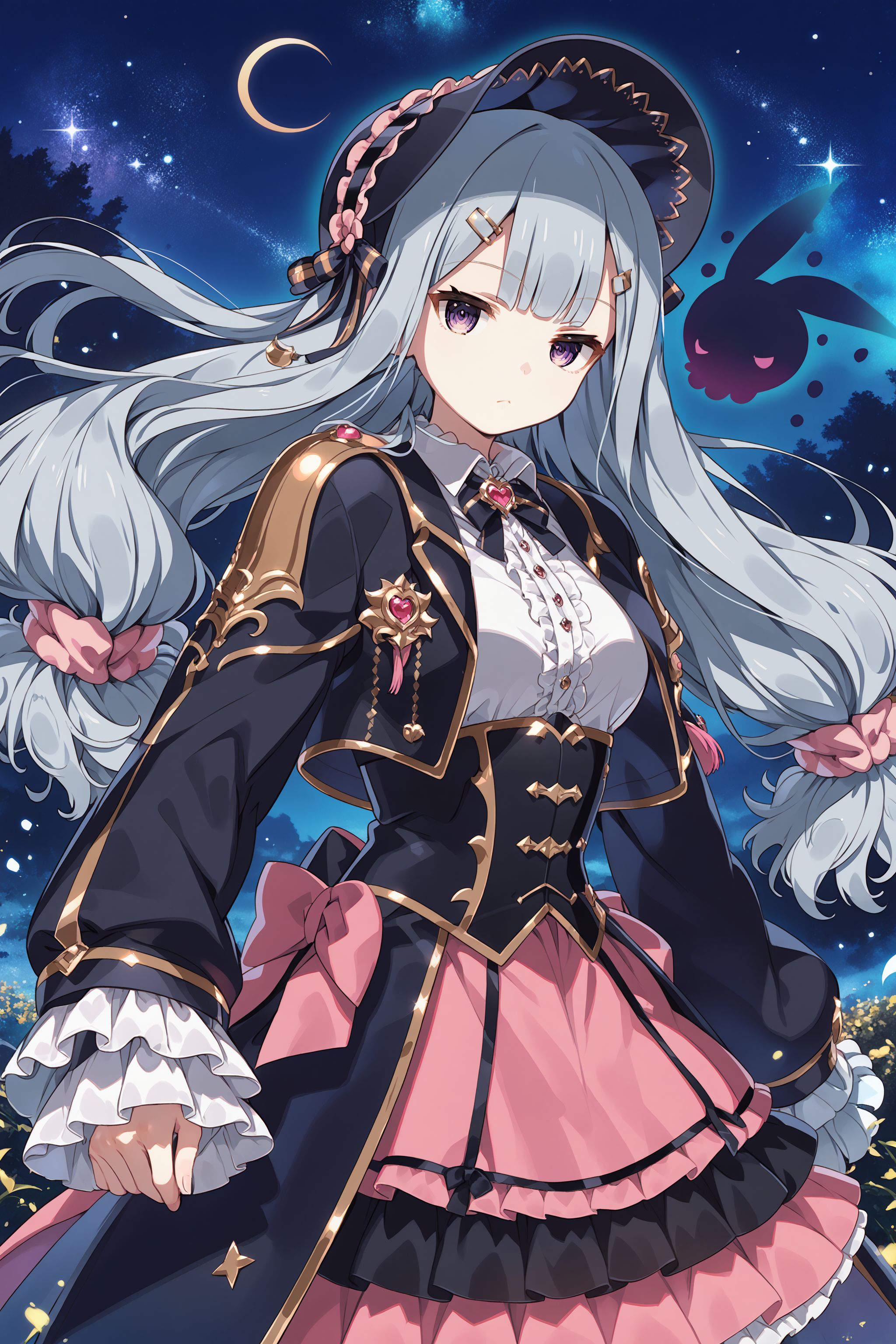 ユニフォーム2: ボネット、ハットリボン、ヘアクリップ、ハートのブローチ、紫シャツ、カラー付きシャツ、フリルシャツ、黒ジャケット、開いたジャケット、長袖、指先より長い袖、ゴールドのトリム、片肩アーマー、黒い翼、青スカート、フリルスカート