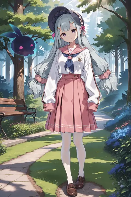 セーラー服: ボネット、ハットリボン、ヘアクリップ、ヘアスクランチ、セーラー服、ピンクのセーラーカラー、白シャツ、長袖、指先より長い袖、青ネッカチーフ、プリーツスカート、ピンクスカート、フリル、白パンティーホース、ローファー