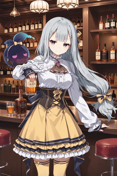 western: ヘアクリップ、ヘアリボン、ストライプリボン、黄色リボン、フリルカラー、茶色のアスコット、ブローチ、紫の宝石、白シャツ、フリルシャツ、中央フリル、長袖、指先より長い袖、黄色コルセット、黄色スカート、フリルスカート、黄色のthighhighs