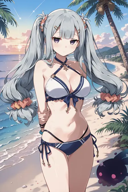ホワイトビキニ: (ツインテール:1.2)、ヘアスクランチ、サイドロックス、水着、ホワイトビキニ、ストラップ、クロスストラップ、肩出し、バストライン、ビーズブレスレット、へそ、黒パンツ