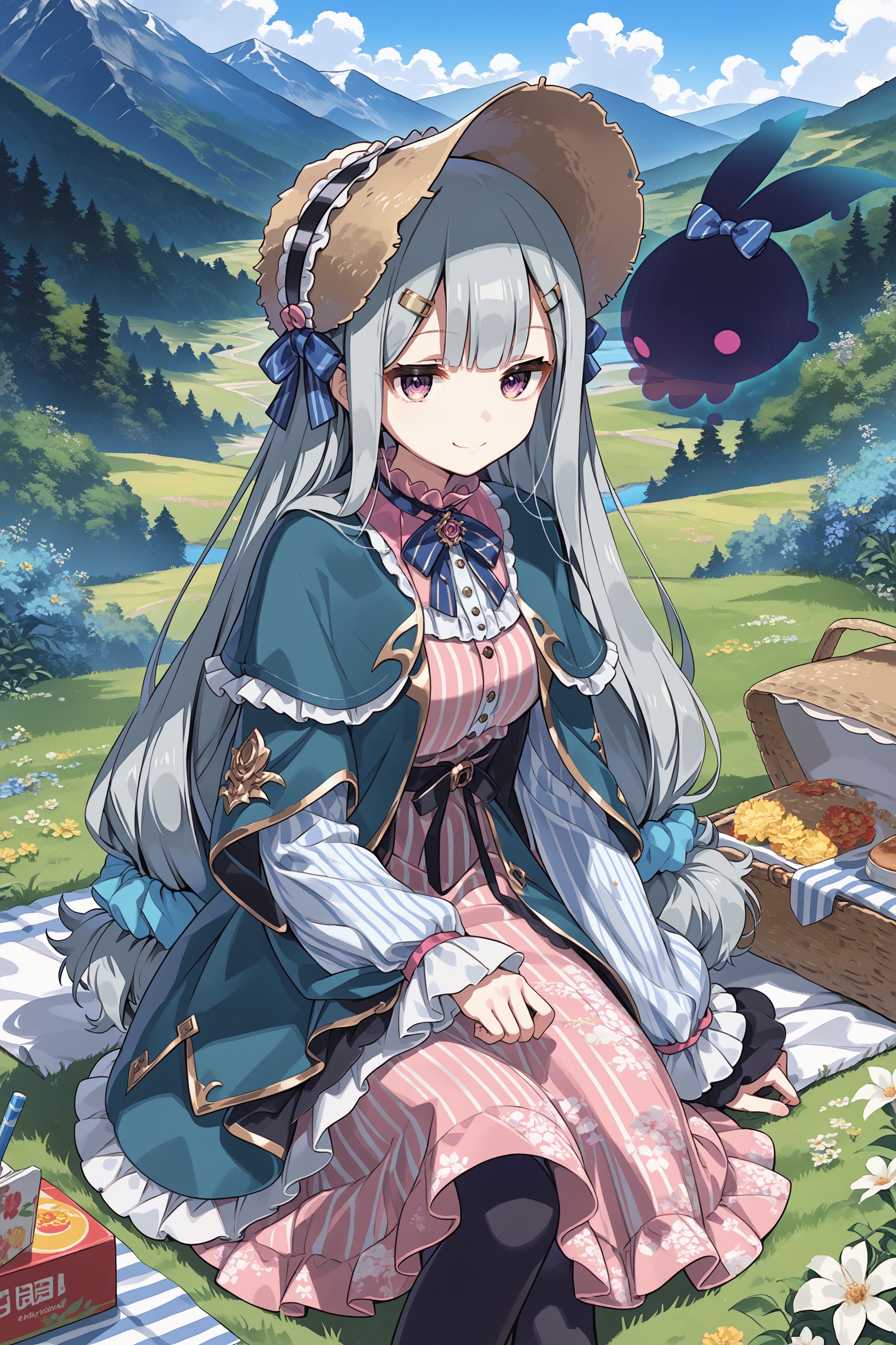 ホリデー3: ボネット、わら帽子、ハットリボン、青リボン、ヘアスクランチ、ヘアクリップ、緑のカーディガン、青ネクタイ、ピンクのドレス、縦縞ドレス、花柄、フリル、長袖、指先より長い袖