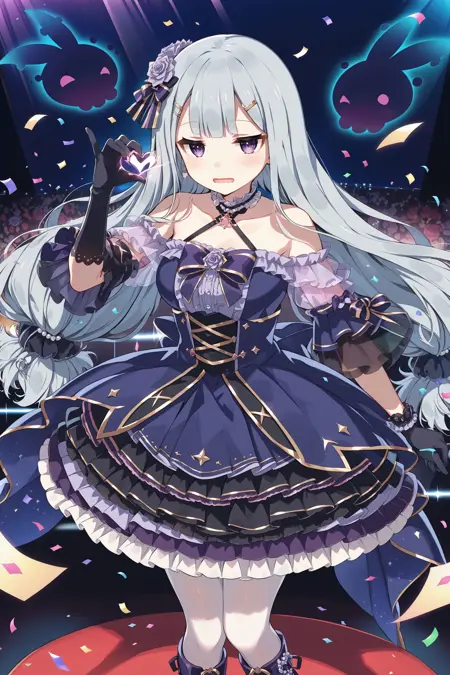 アイドル: ヘアフラワー、紫の薔薇、ヘアリボン、ヘアクリップ、星(symbol)、ヘアスクランチ、パールヘア裝飾、アイドル衣装、フリルチョーカー、鎖骨、肩出し、クロスストラップ、紫ドレス、紫ネクタイ、フリルドレス、分離袖、透け袖、肘手袋、黒手袋、フリルスカート、重ねスカート、白パンティーホース、レースアップブーツ、紫ブーツ