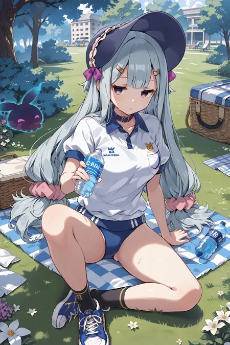 体育着: ボネット、ハットリボン、紫リボン、ヘアクリップ、ヘアスクランチ、体育着、カラー付きシャツ、青カラー、白シャツ、ふくらはぎ袖、青ブルマ、黒靴下、スニーカー