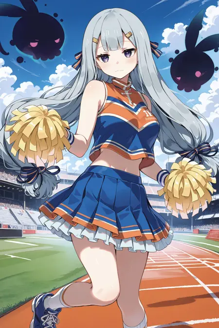 チアリーダー: ヘアクリップ、ヘアリボン、チアリーダー、多色シャツ、オレンジシャツ、青シャツ、ノースリーブ、肩出し、ショートトップ、へそ出し、リストバンド、フリルスカート、プリーツスカート、多色スカート、青スカート、オレンジスカート、ソックス、青の靴