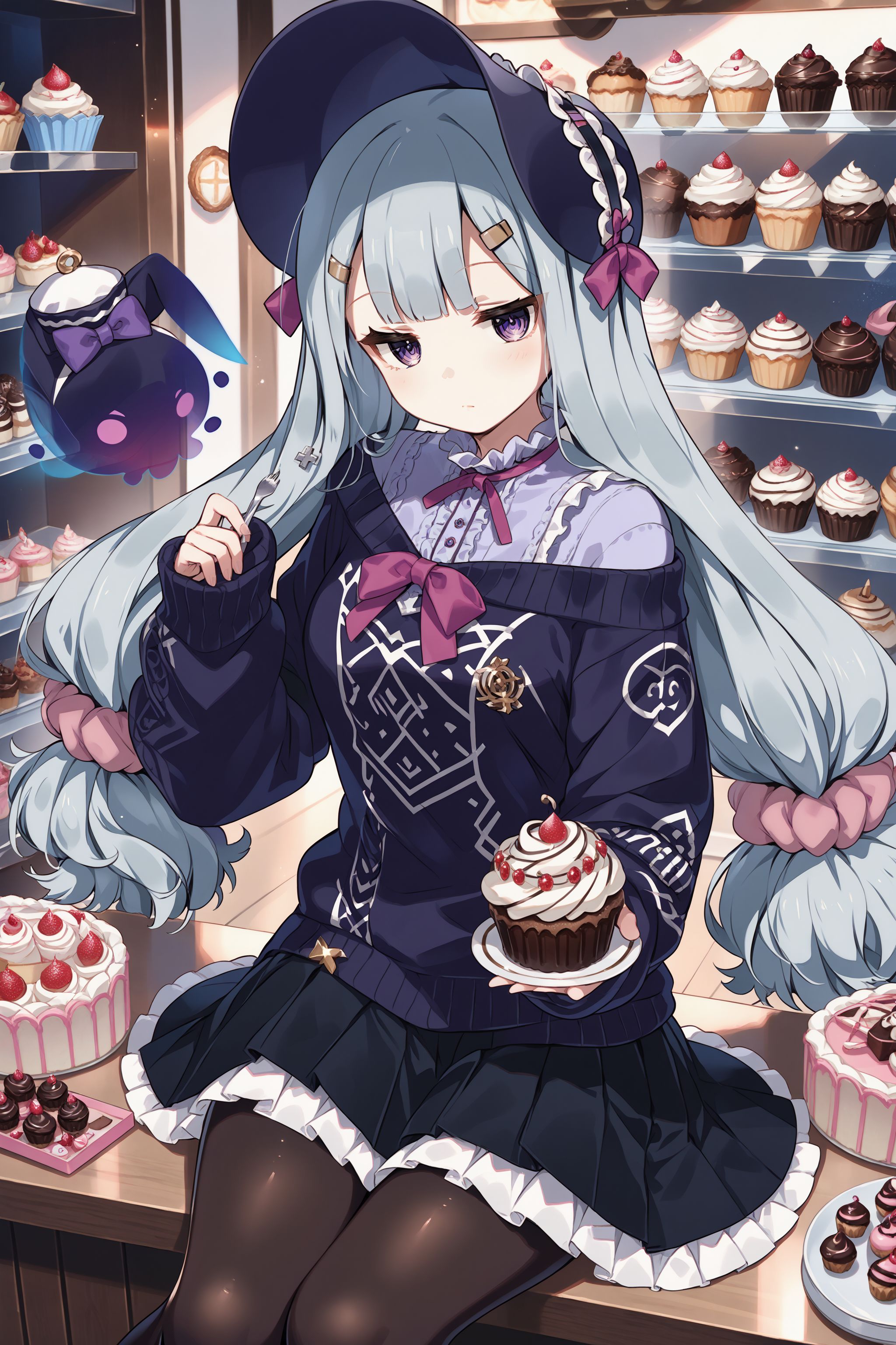 セーター: ボネット、ハットのリボン、紫色のリボン、ヘアクリップ、ヘアスクランチ、黒いセーター、長袖、指先より長い袖、肩出し、紫のシャツ、フリルシャツ、クロスタイ、黒いスカート、プリーツスカート、黒いパンティーホース