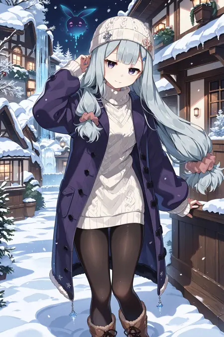 冬: ビーニー、白キャップ、ヘアスクランチ、紫コート、ふっくら長い袖、手首より長い袖、開いたコート、タートルネックセーター、セータードレス、白セーター、黒パンティーホース、ファー付きブーツ、プラットフォームシューズ、茶色の靴