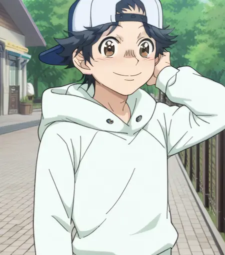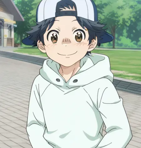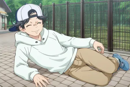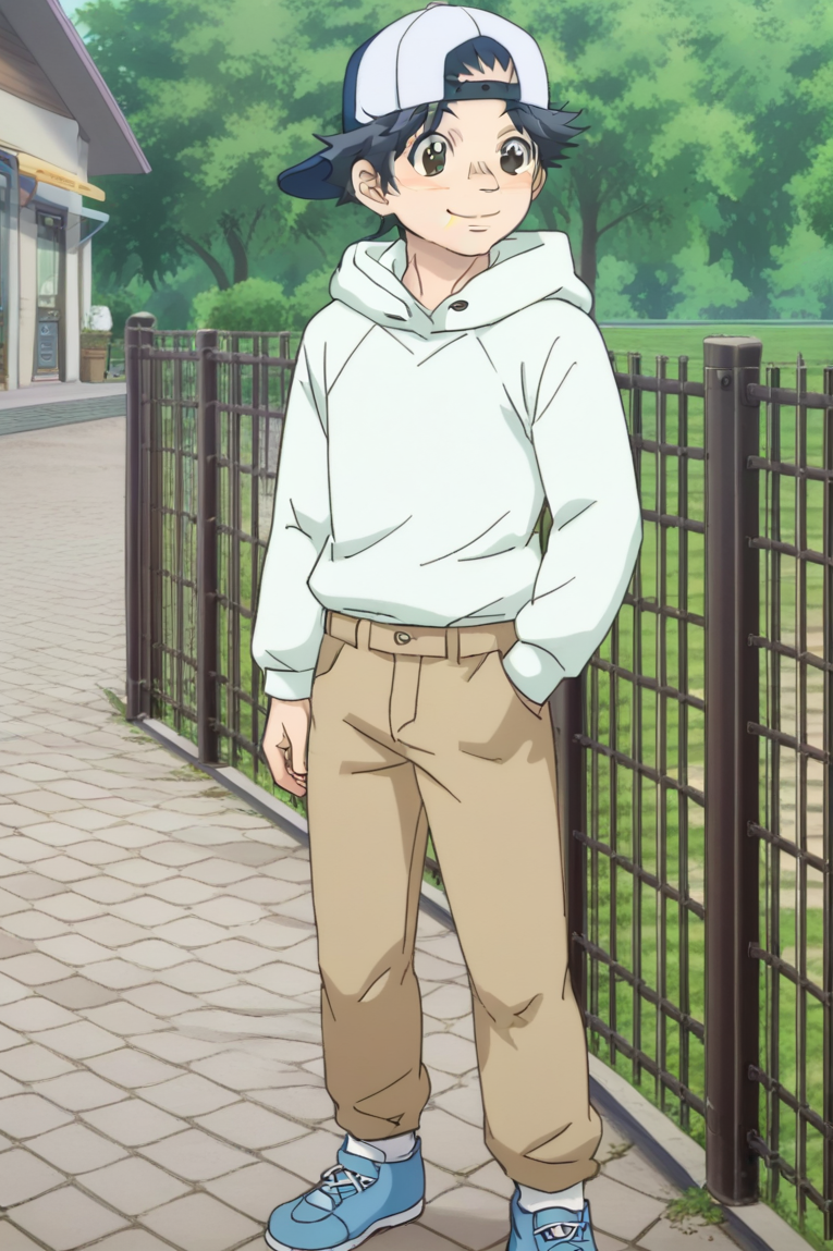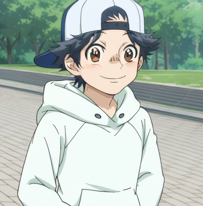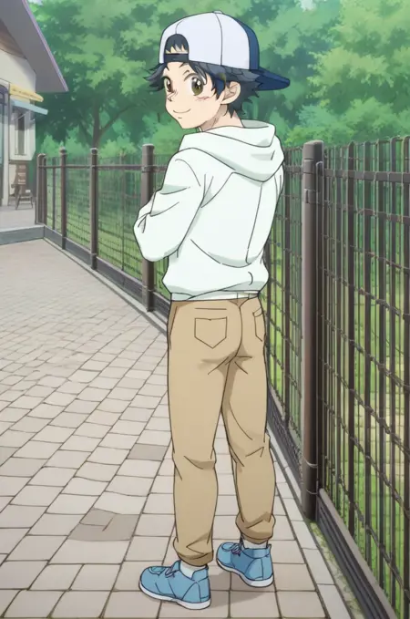Prompts: male, black hair, brown eyes, baseball cap, backwards hat, white hoodie, tan pants, white socks, light blue shoes, outdoors (park/road/grass/fence)