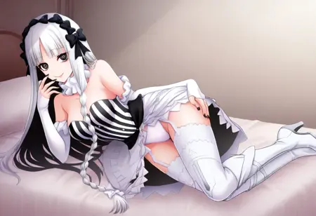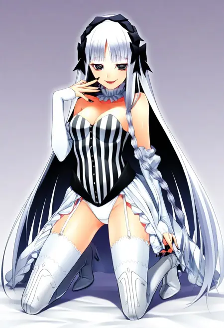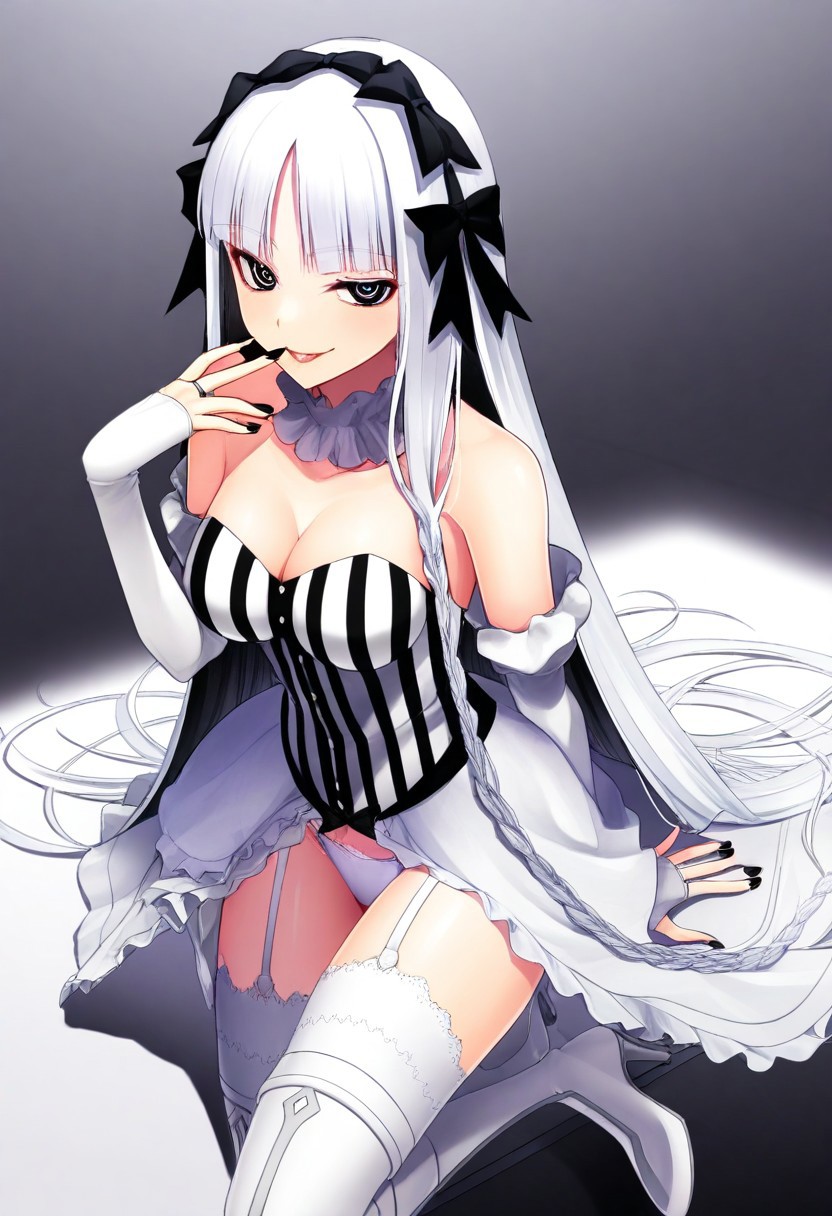 트리거 단어: francesca_prelati, 검은 눈, 고리 모양 눈동자, 기호 모양 동공, 흰 머리, 긴 머리, 둔한 앞머리, 땋은 머리, 머리 리본, 검은 리본, 머리띠, 중간 크기 가슴, 네일 폴리시, 검은 손톱, 분리된 칼라, 벗겨진 어깨, 분리된 소매, 장갑, 손가락 없는 장갑, 흰 드레스, 줄무늬 옷, 줄무늬 드레스, 수직 줄무늬 옷, 수직 줄무늬 드레스, 스트랩리스, 가슴 노출, 프릴, 치마, 쇼걸 치마, 검은 리본, 흰 속옷, 속옷, 허벅지 고정 끈, 흰 허벅지 양말, 하이힐 부츠, 하이힐, 부츠, 허벅지 부츠, 흰 신발