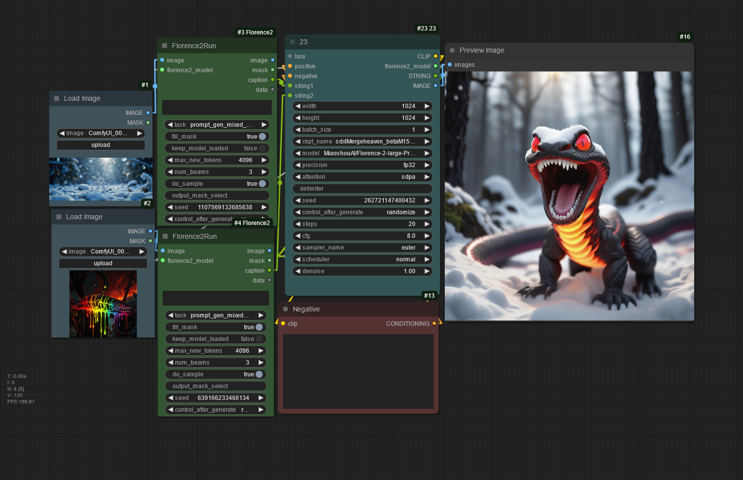 上传两张图片,使用Florence识别两张图片,合并两张图片的提示词,生成一张新图片。