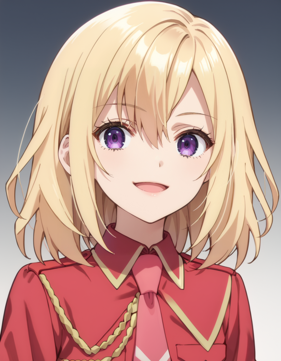 군복, 빨간 칼라 셔츠, 에기울렛, 빨간 넥타이, 긴 소매, 벨트, 빨간 치마, 프릴이 달린 치마, 팬티스타킹, 십자 끈 신발, 갈색 신발