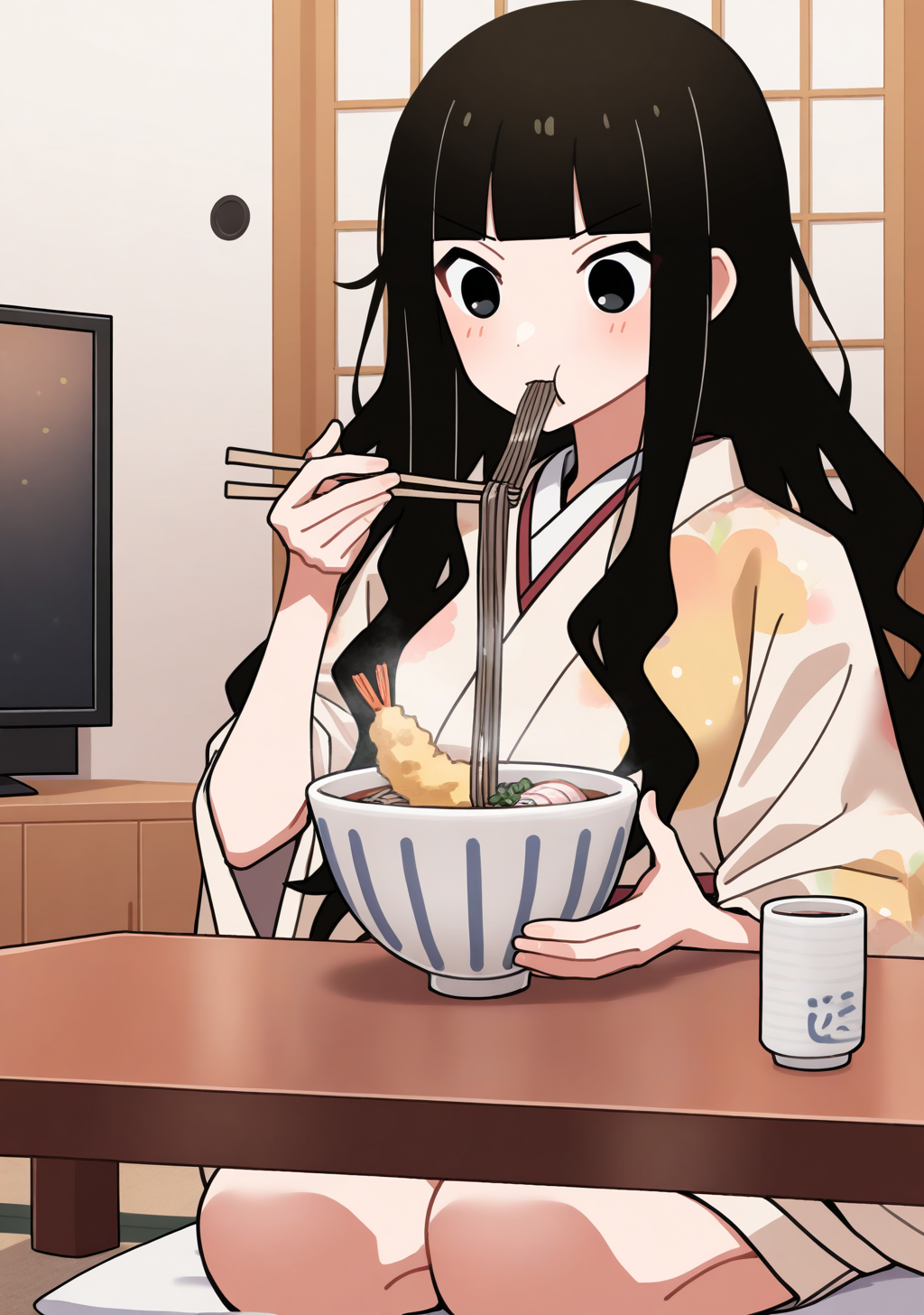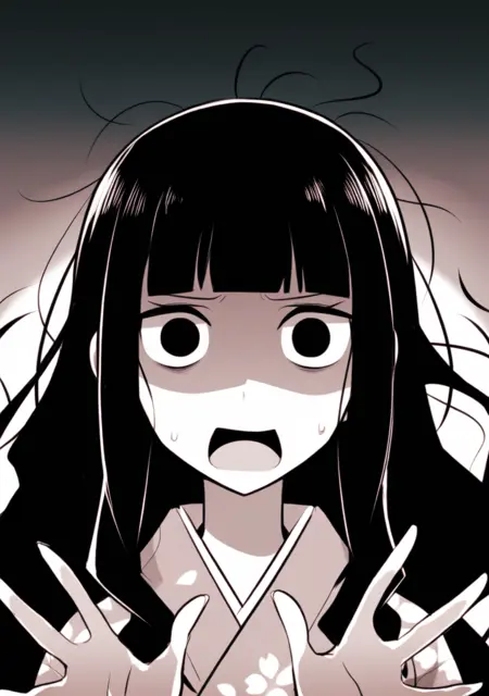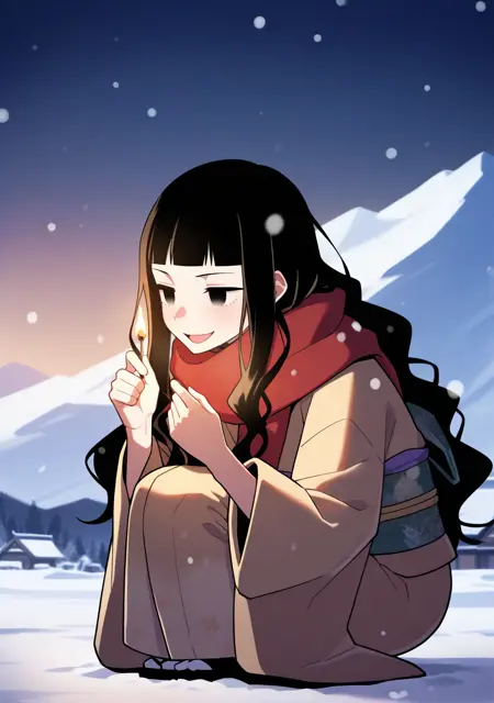 "긴 머리, 검은 머리, 파동 모양 머리, 곧은 앞머리, 검은 눈"