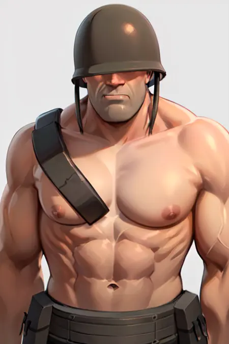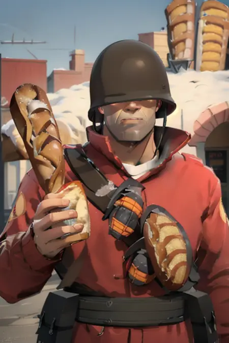 helmet, red/blue jacket, bandolier, two grenades, covered eyes, on prompts can help